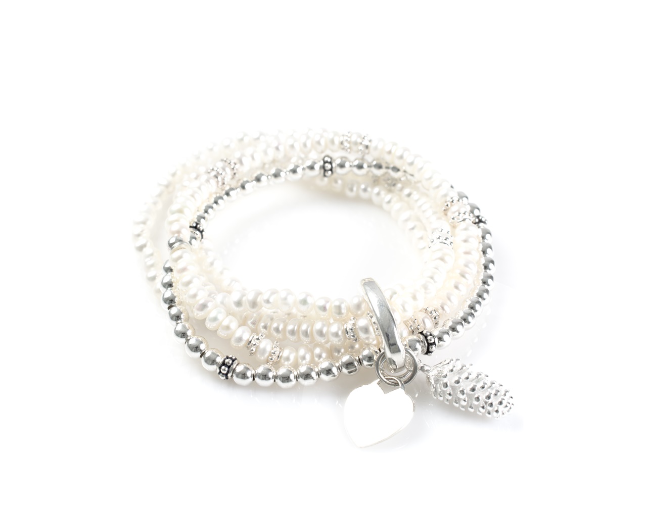 Feines, fünfreihiges dehnbares Armband. Vier Perlen- und ein Silberarmband bilden eine schöne Einheit. In die Perlenbänder sind kleine Silberteile eingearbeitet und geben dem Armschmuck eine besondere Note. Den Abschluss zieren ein stilvoller Karabiner mit einem Herz und einem Tannzapfen, alles in 925 Sterling Silber.