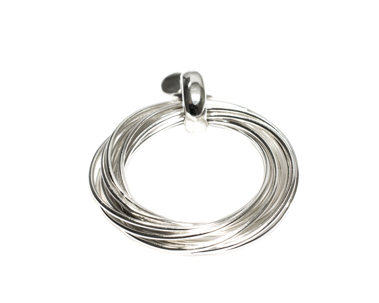 Damenschmuck » AnhängerDas wunderschöne Schmuckstück aus 925 Silber begeistert mit seinem modernen Design. 12 ineinander verflochtene Ringschienen machen den Anhänger zu etwas Besonderem. Der Anhänger kann individuell mit verschieden Ketten kombiniert werden. Ca. 4 cm Durchm.